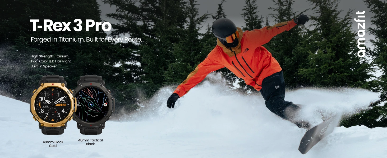 Rugged by Design: The T-Rex 3 Pro smart watch is adventure-ready with sapphire glass, a bright 3000-nit AMOLED display, and a titanium alloy bezel and buttons - available in 48mm or 44mm to match your style.