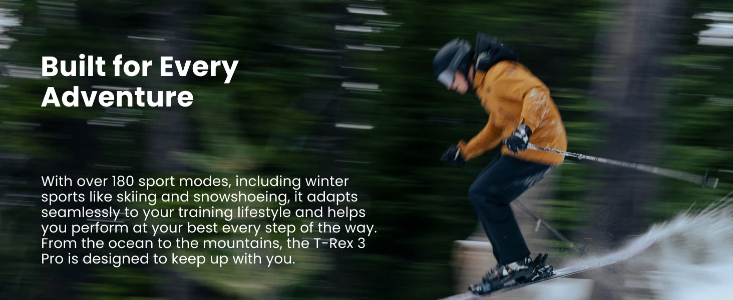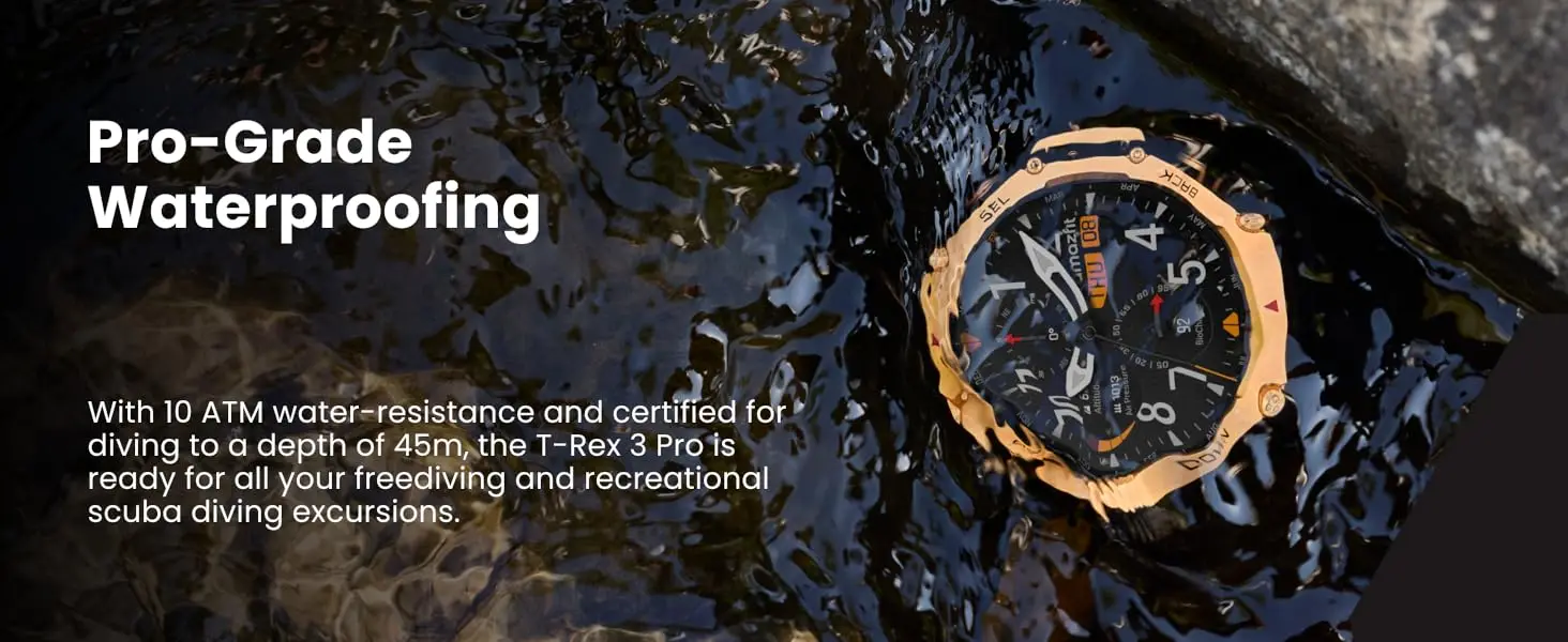Built for Every Adventure: With 180+ sport modes, HYROX training, 10 ATM water resistance, and diving certification to 45m, the Amazfit T-Rex 3 Pro activity tracker is built to excel from ocean depths to mountain peaks.