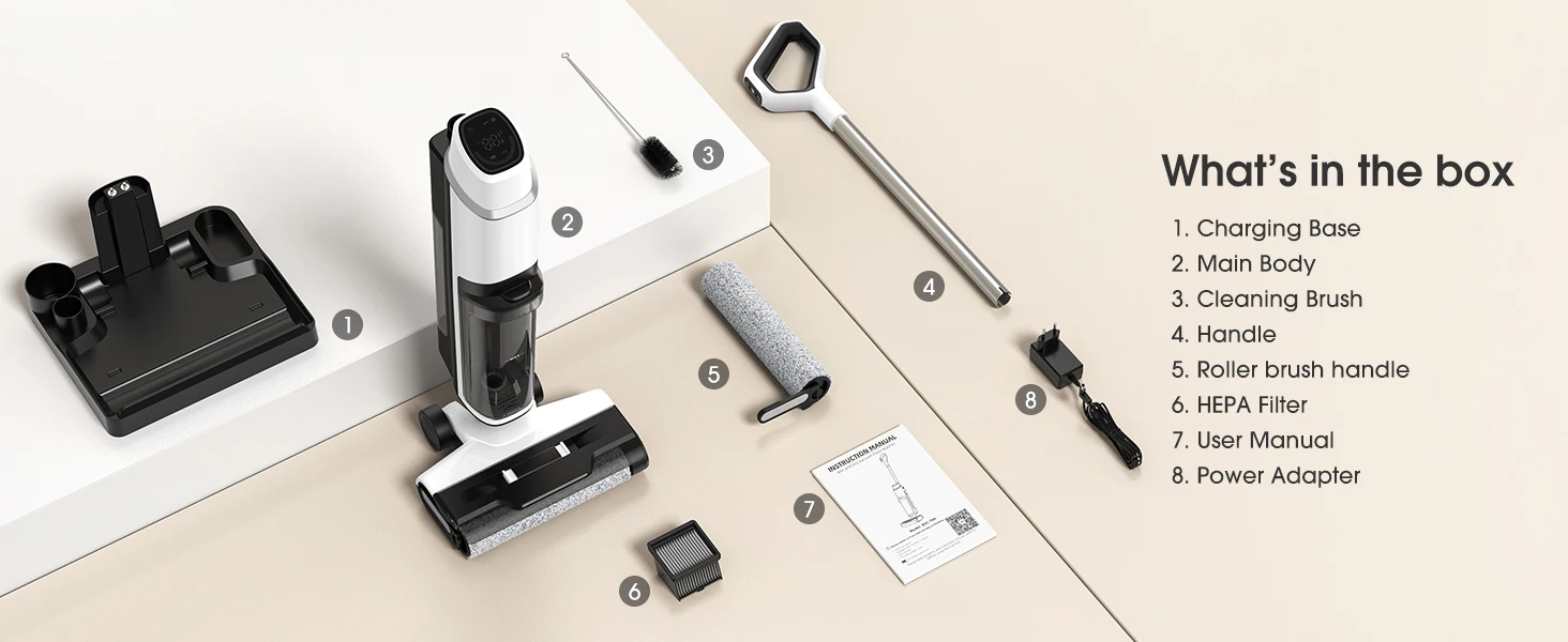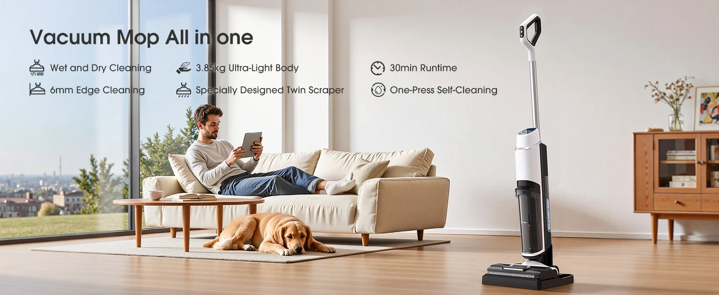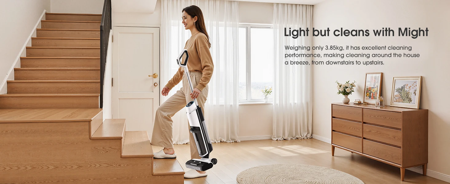 This 3.85kg ultra - light floor cleaner offers wet & dry cleaning, 6mm edge cleaning, and one - press self - cleaning. With a 30 - minute runtime, it’s perfect for quick home cleanups—whether you’re relaxing on the couch with your pet or need to tidy up before guests arrive.