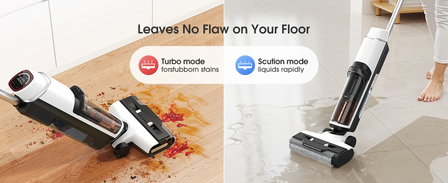 Equipped with Turbo mode (for stubborn stains like spilled sauce) and Suction mode (for rapid liquid pickup, such as coffee spills). Ideal for messy kitchens or bathrooms—ensures no flaw on your floor, handling both tough dirt and wet messes with ease.