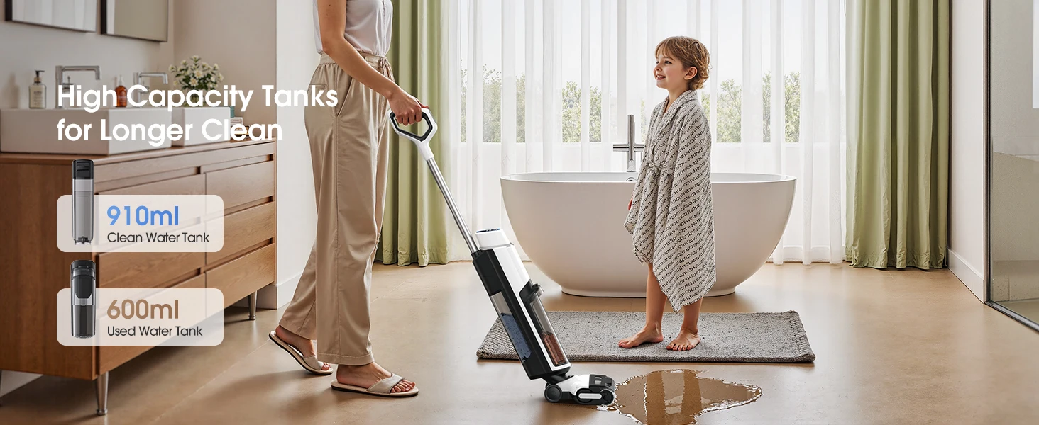 910ml clean water and 600ml dirty water tanks allow longer cleaning sessions. Ideal for cleaning big spills in bathrooms or kitchens without frequent tank refills—handle large messes in one go.