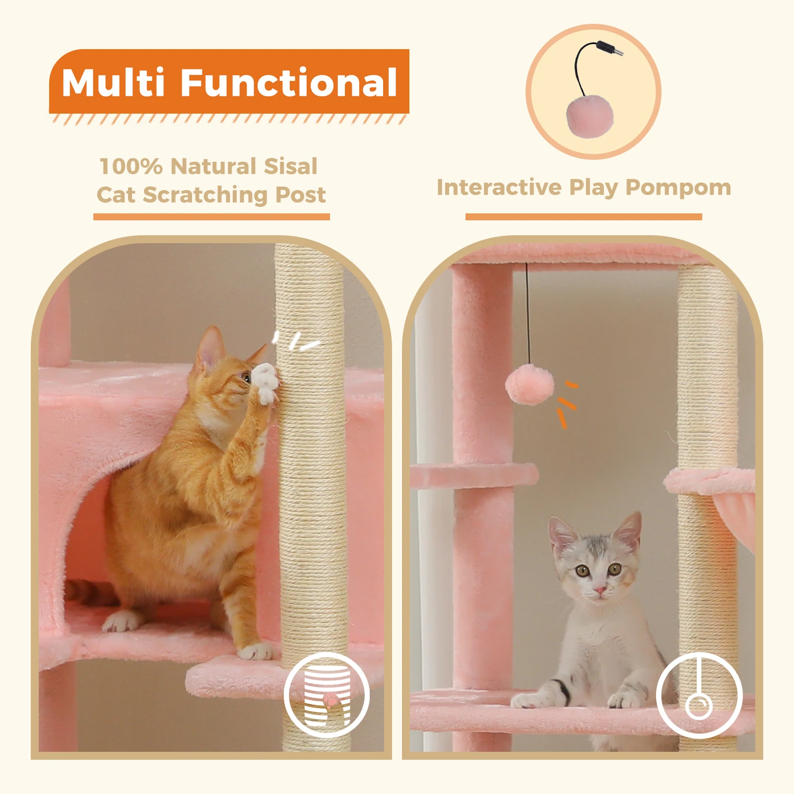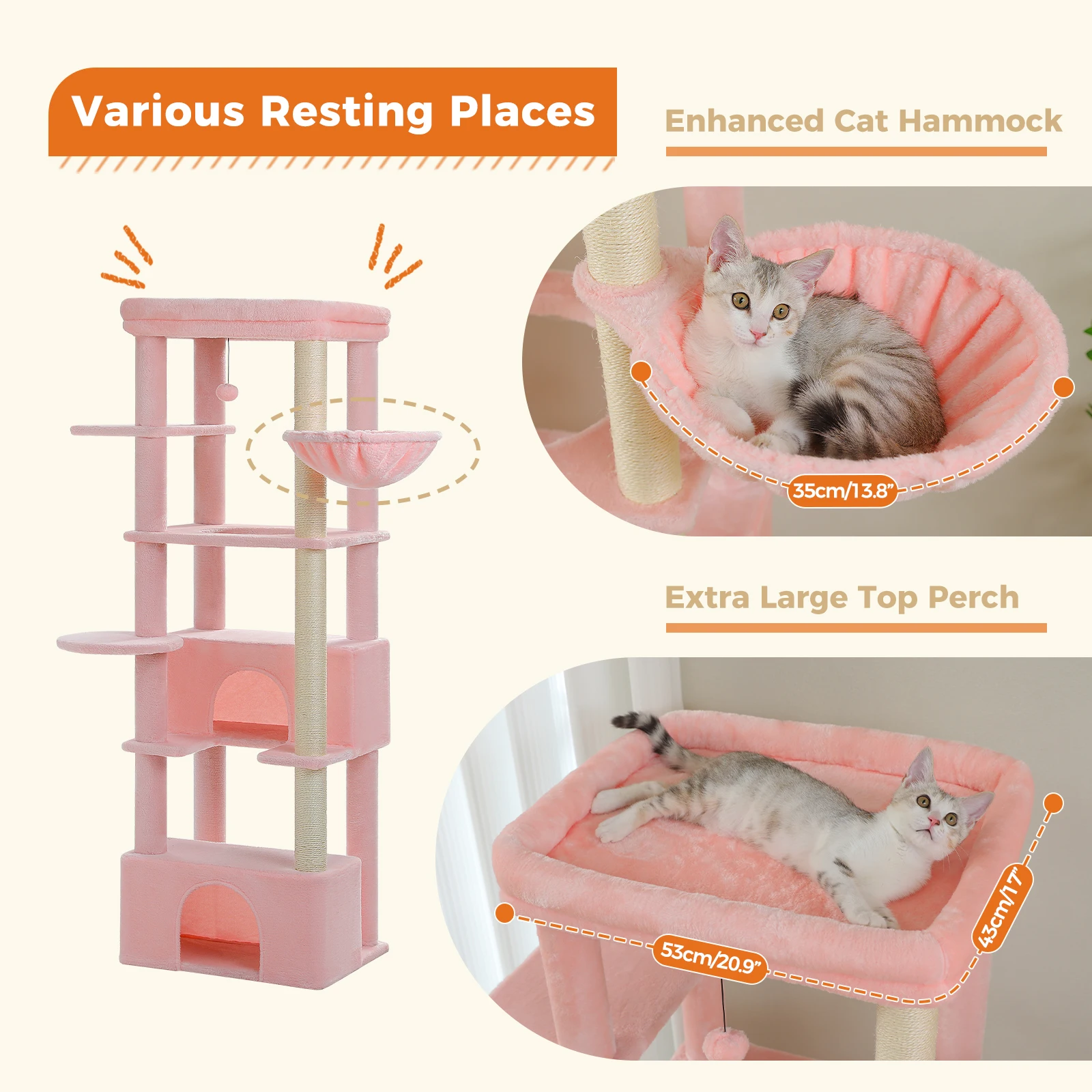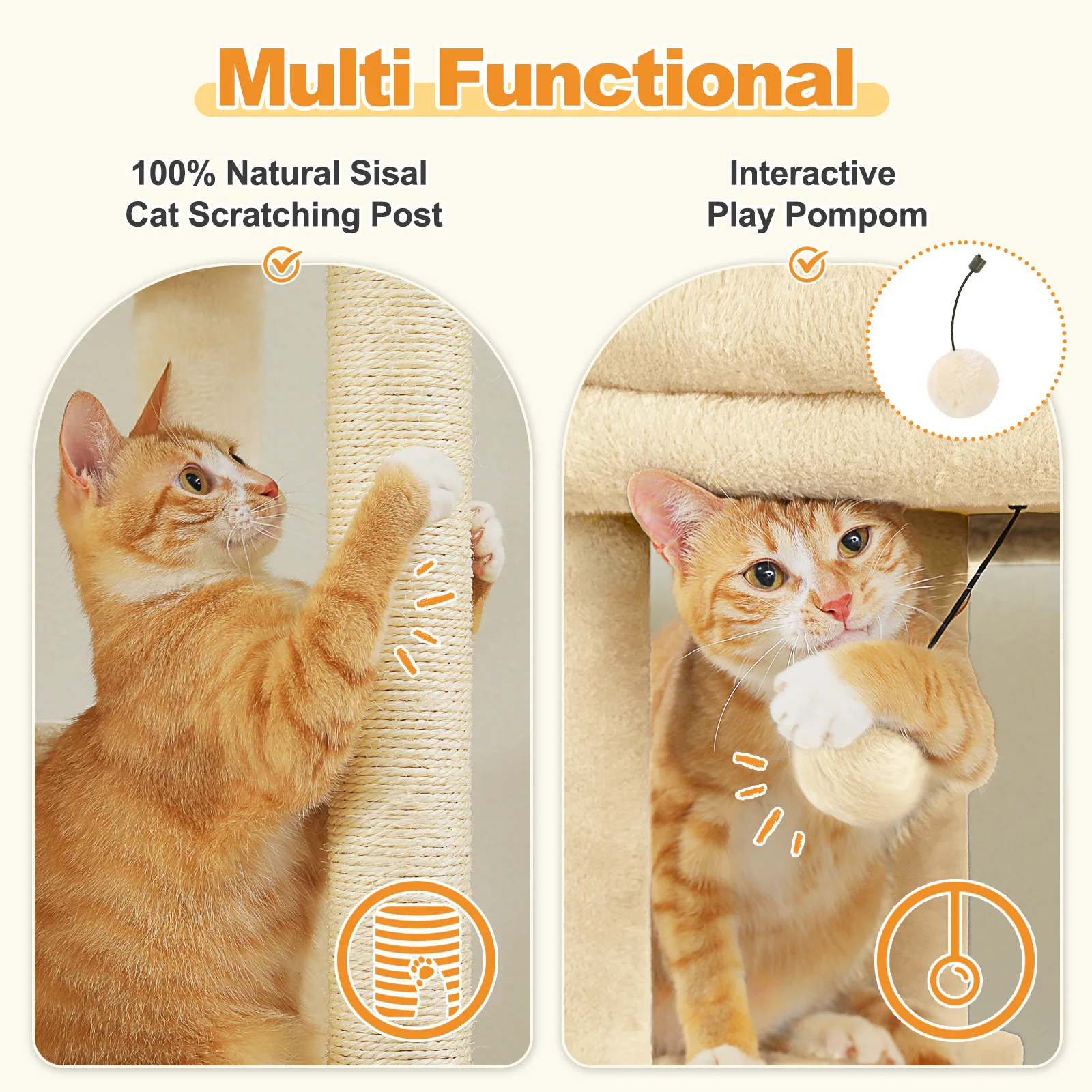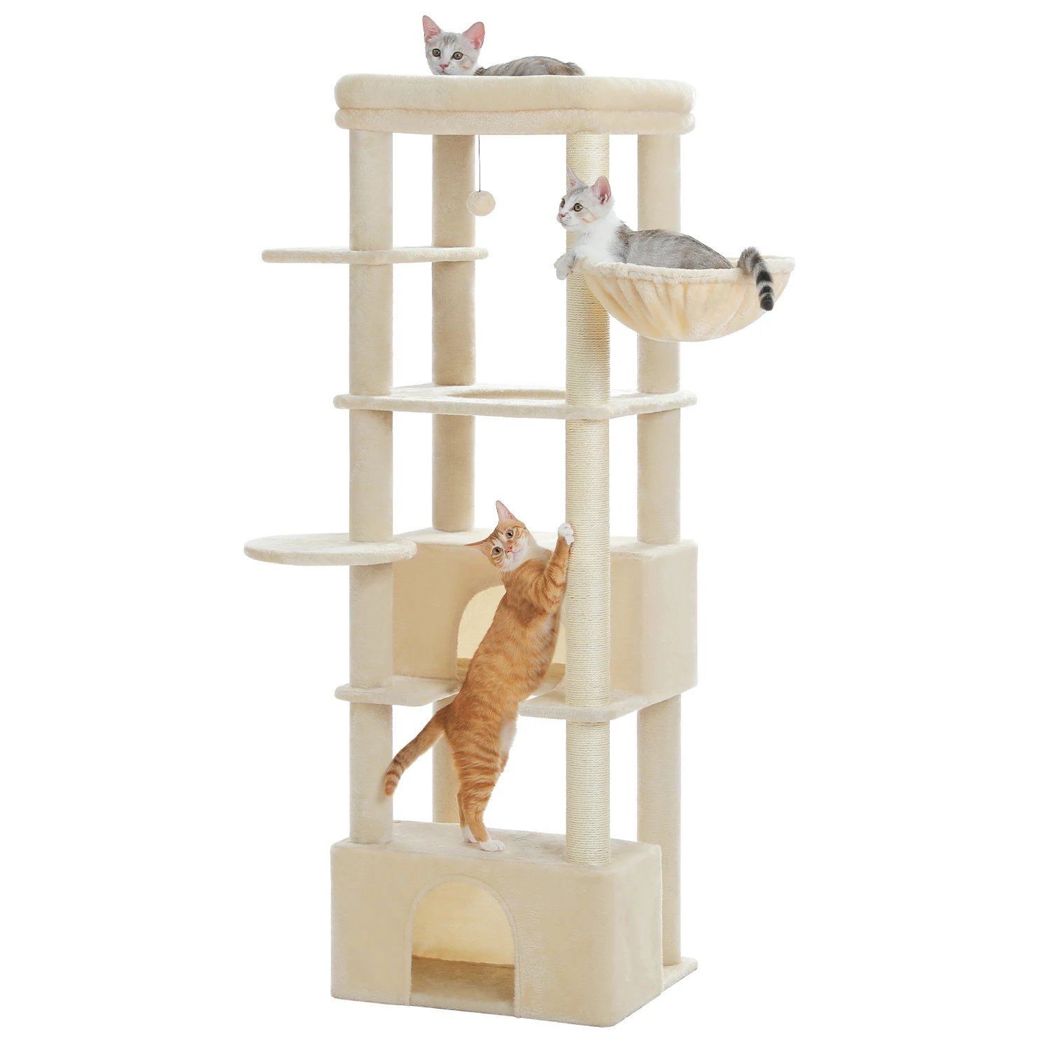 Fun Cat Playhouse: This multi-level cat tree features various resting places and extra entertainment facilities. Your cats can sleep in the cat condo or hammock on the different height, scratching on the 100% natural sisal post or jump up and down to play the toyball. This wonderful cat playhouse makes feline friends feel at paradise.