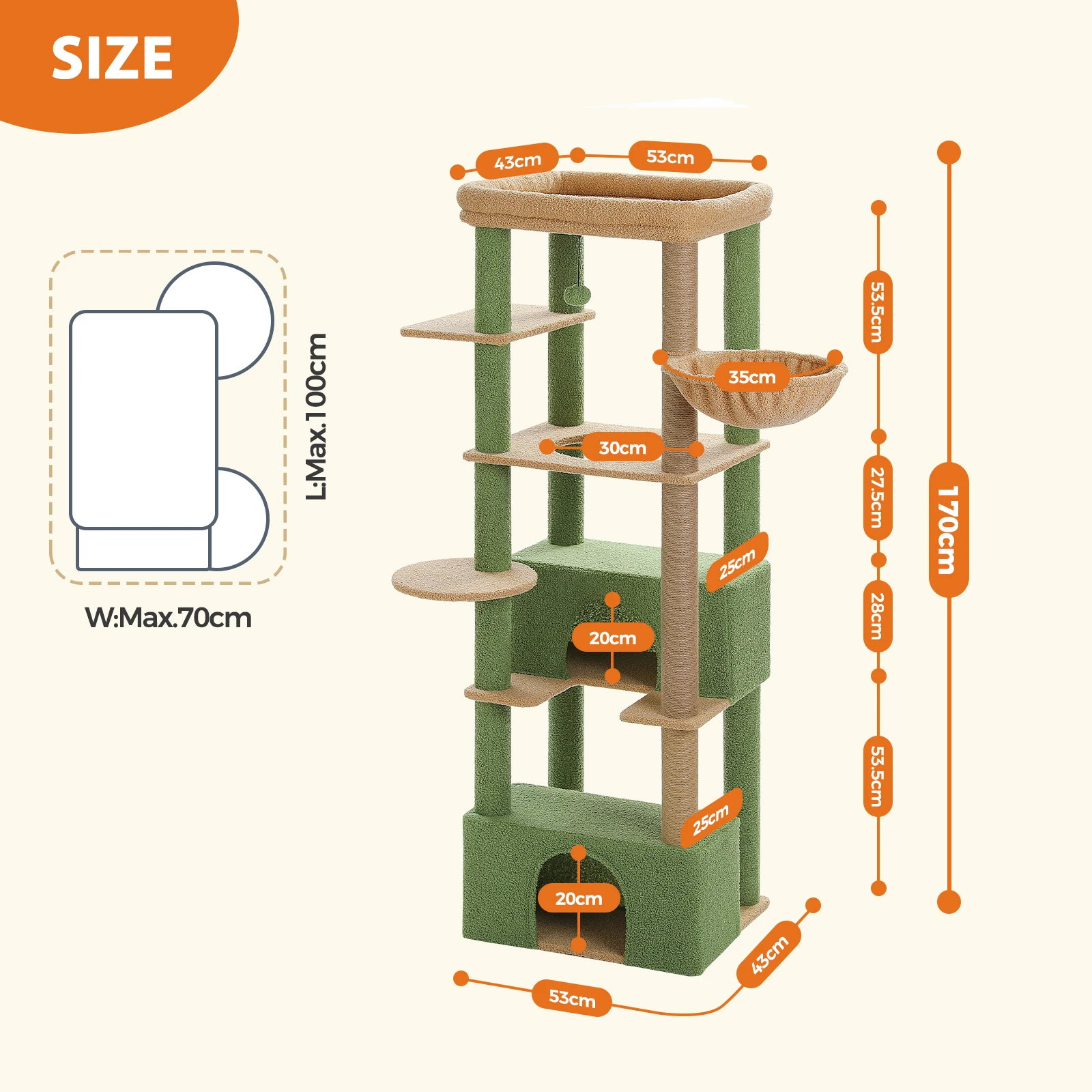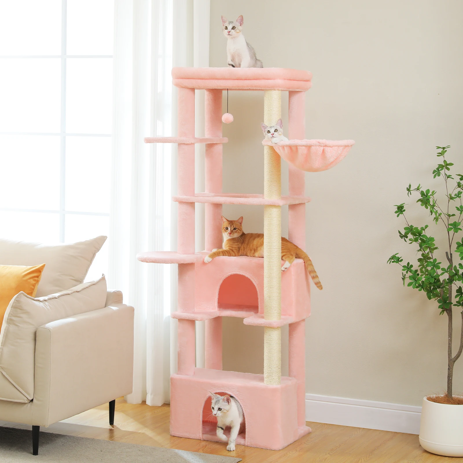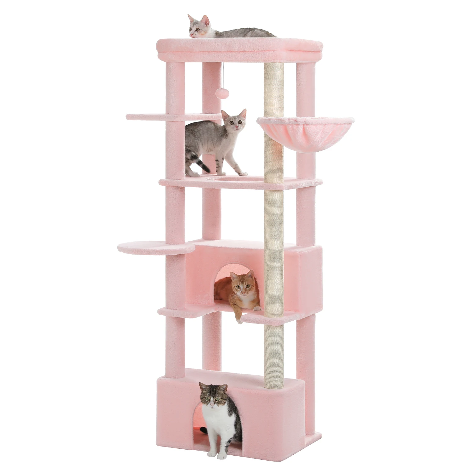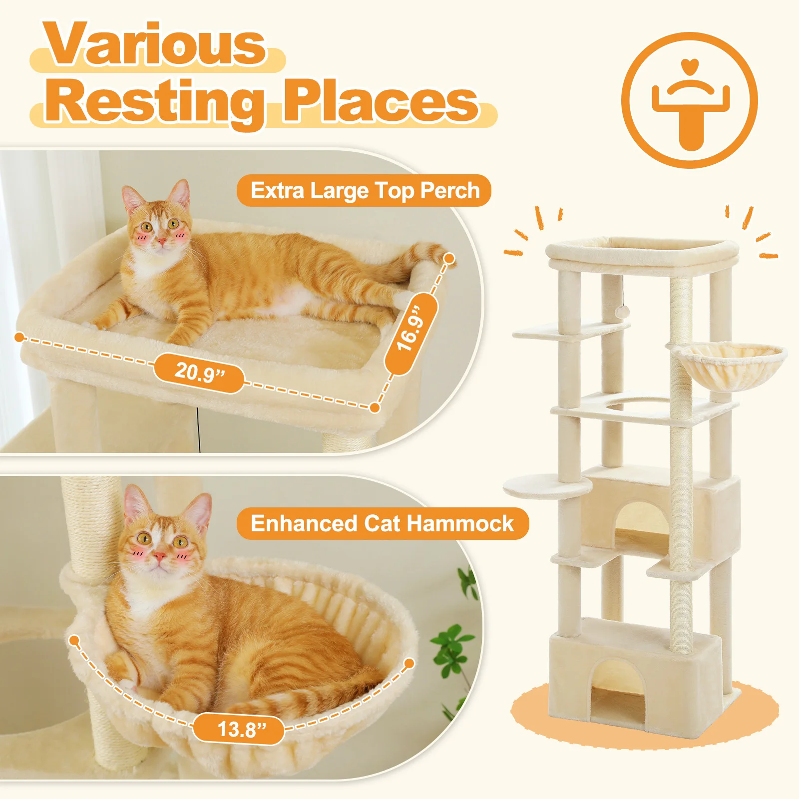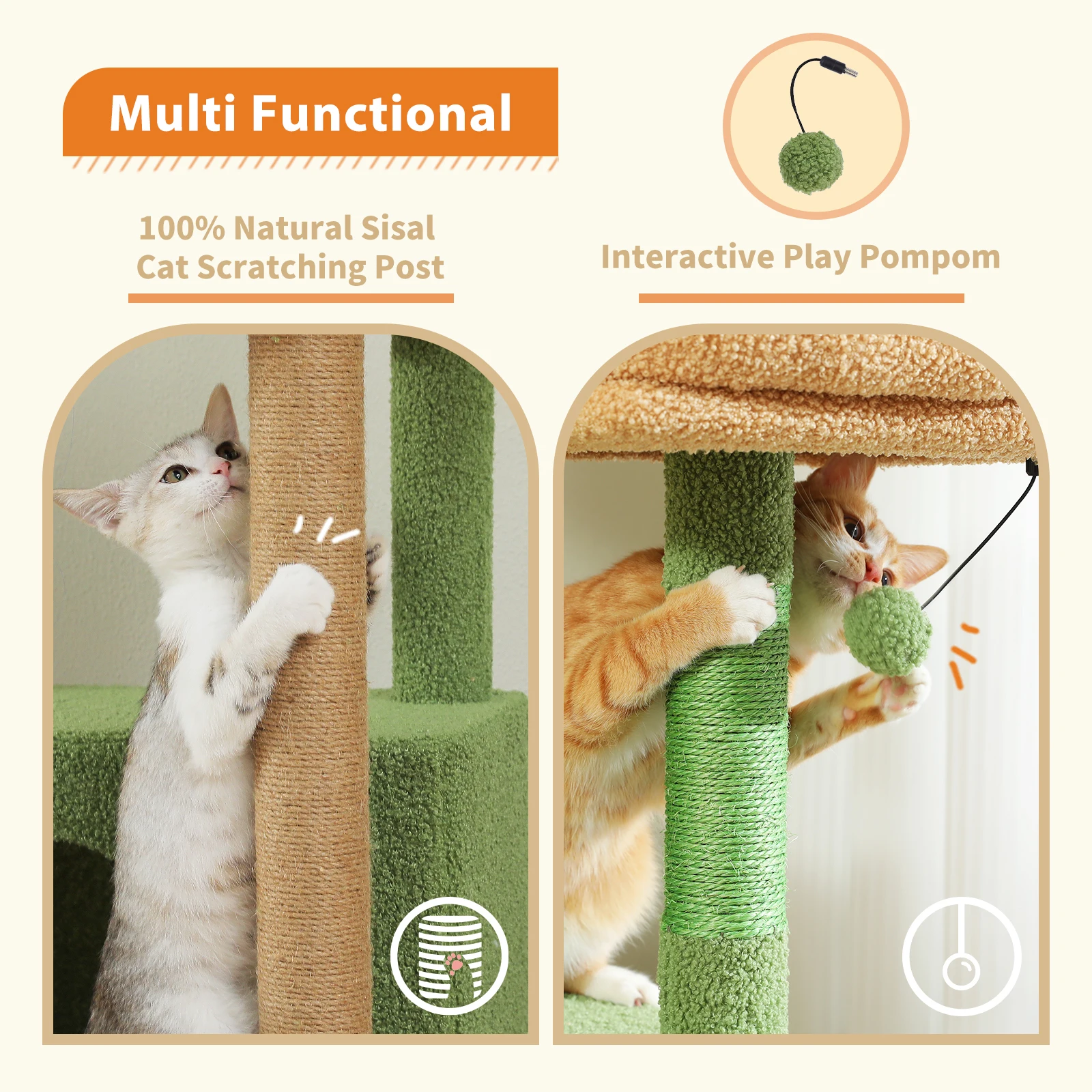 Fun Cat Playhouse: This multi-level cat tree features various resting places and extra entertainment facilities. Your cats can sleep in the cat condo or hammock on the different height, scratching on the 100% natural sisal post or jump up and down to play the toyball. This wonderful cat playhouse makes feline friends feel at paradise.
