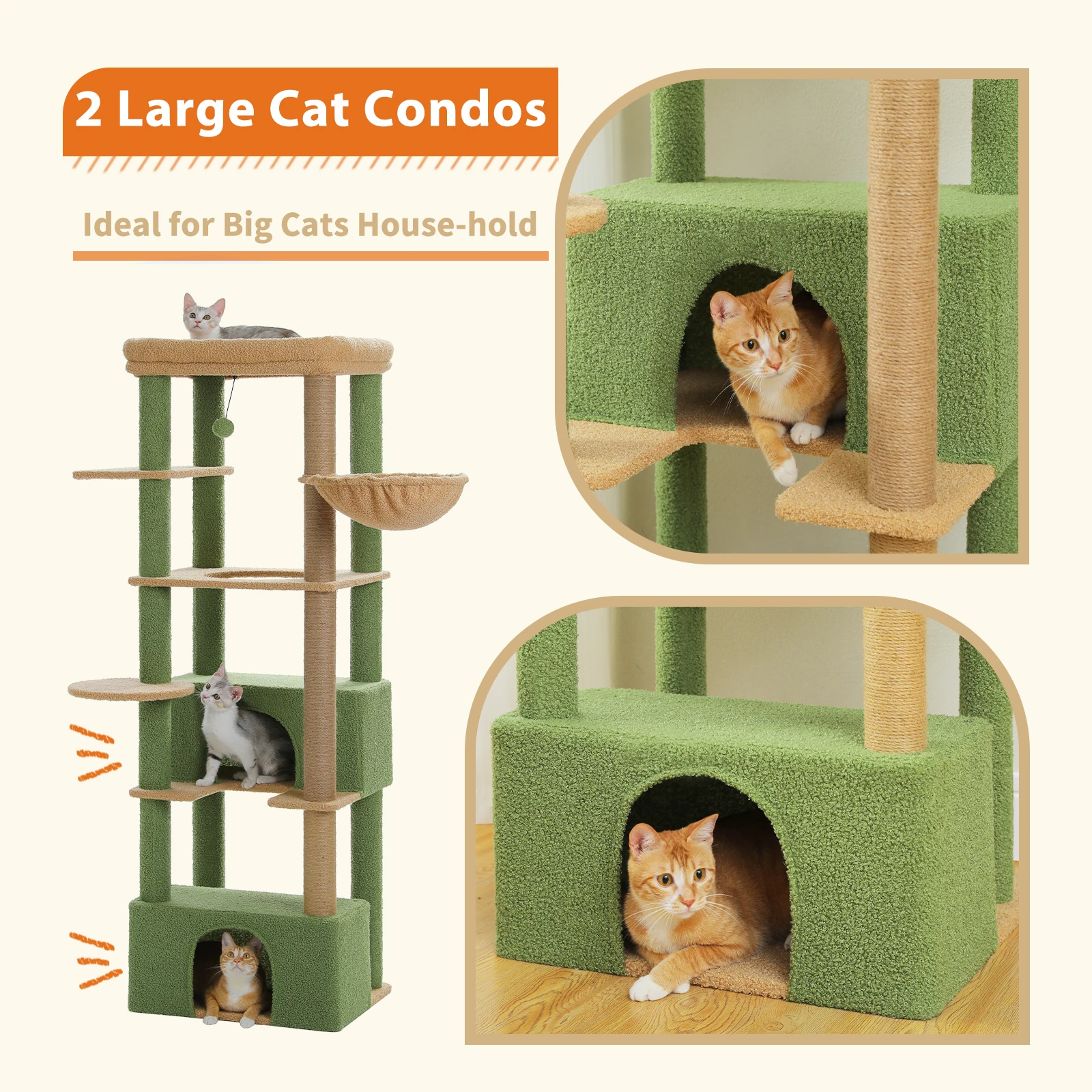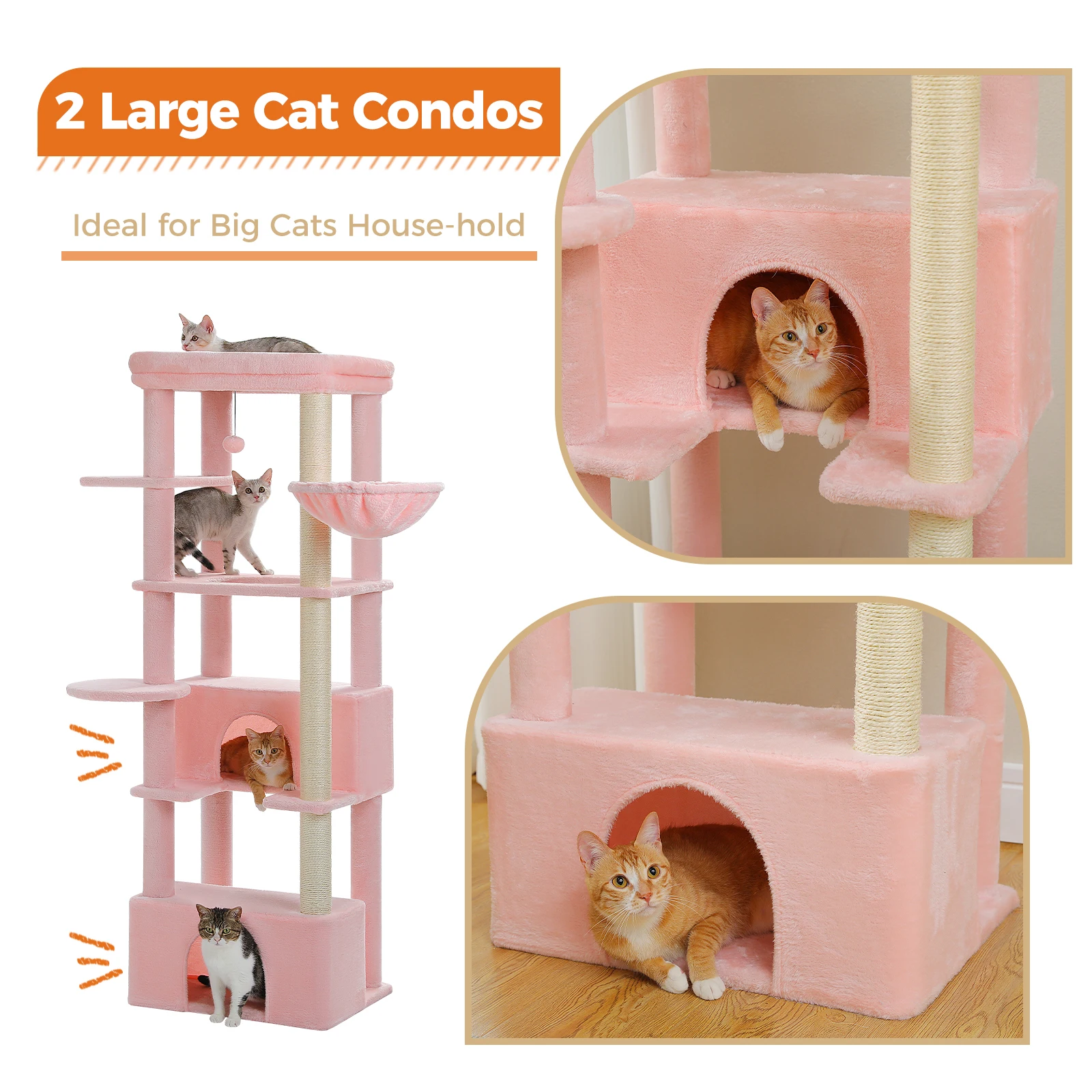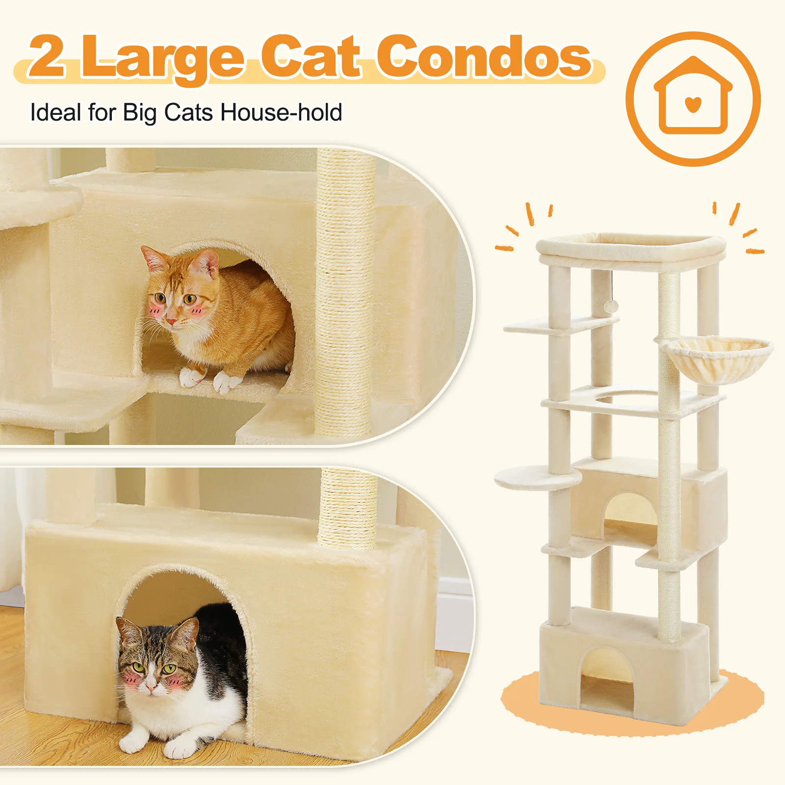 Ideal for Large Cats: This cat tree is specially designed for Large cats Adult (20 lbs heavy duty), featuring 2 spacious cat condos, a enhanced cat hammock and an extra-large top perch to comfortably accommodate the size and activity of large cats.