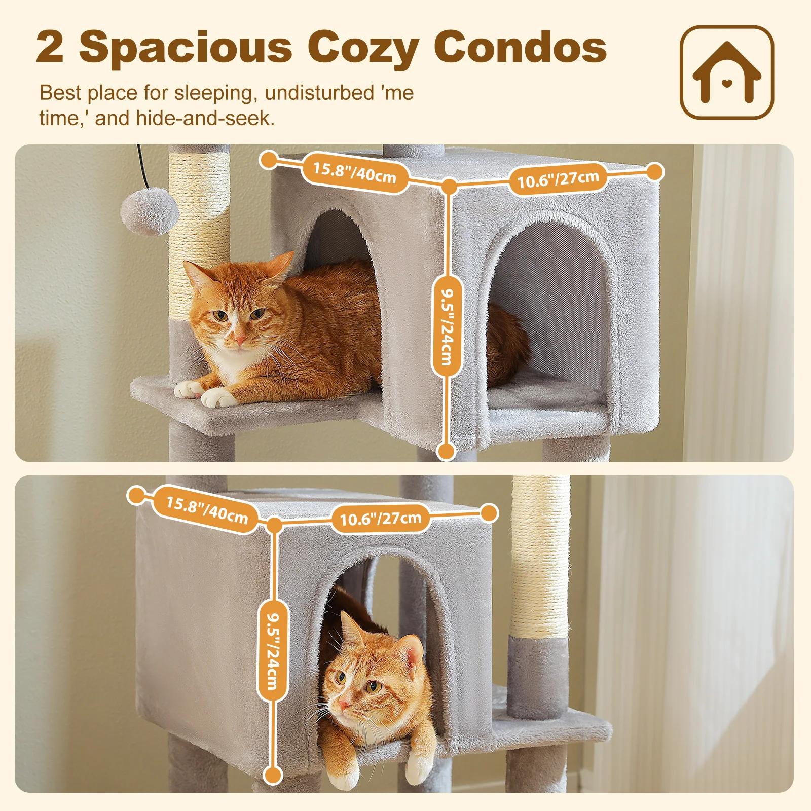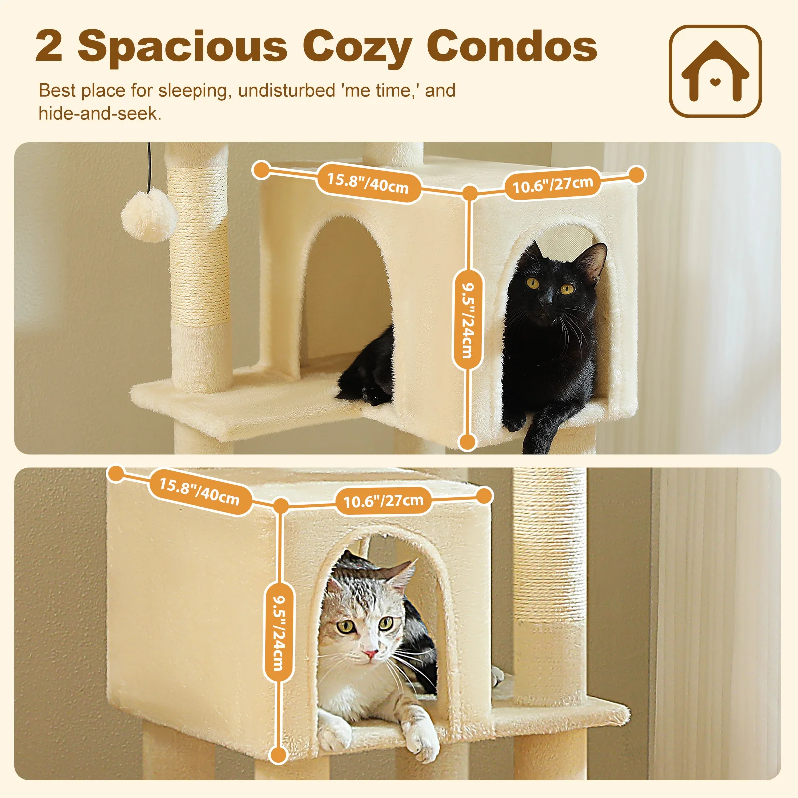 Dual Spacious Condos: This cat tower features two generously sized condos, providing your cats with roomy and comfortable spaces to rest and retreat. These large condos are perfect for accommodating multiple cats or giving a single cat plenty of room to stretch out.