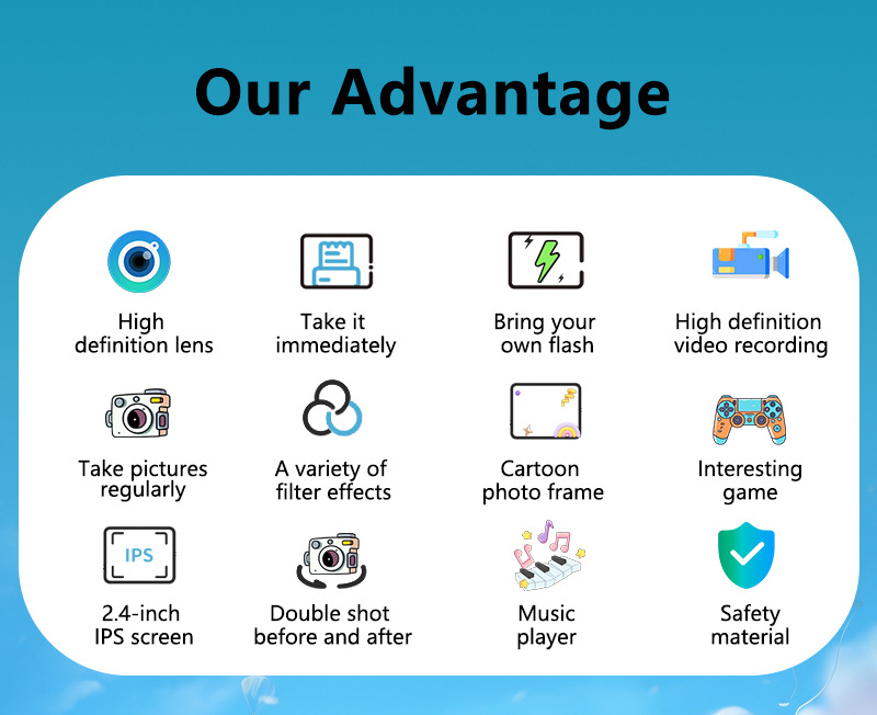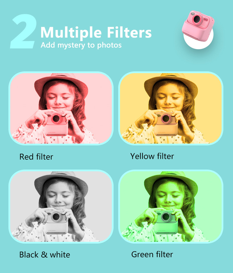 Multifunctional Kids Digital Camera: The kids instant camera has rich features, including instant printing, capture colorful pictures and HD 1080p videos, 2.4 inch IPS screen,16x digital zoom, 3 puzzle games, flash, time-lapse, continuous shooting, playback, music player, 20+ filter frames etc. The design is compact and lightweight,and the buttons are simple to operate, making it easy for children to master.