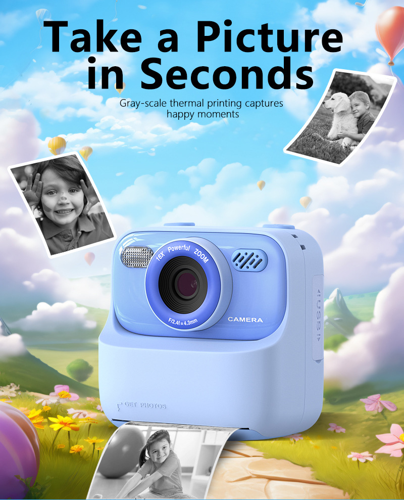 Instant Print Kids Camera: More fun with instant print, The kids cameras are equipped with 2 print modes, grayscale printing & dot matrix printing, and 3 types of color depth printing, allowing kids to experience various styles and effects. Upgraded to dual-camera configuration, easy to take selfies. Just turn on the switch key to enjoy the fun of taking photos.