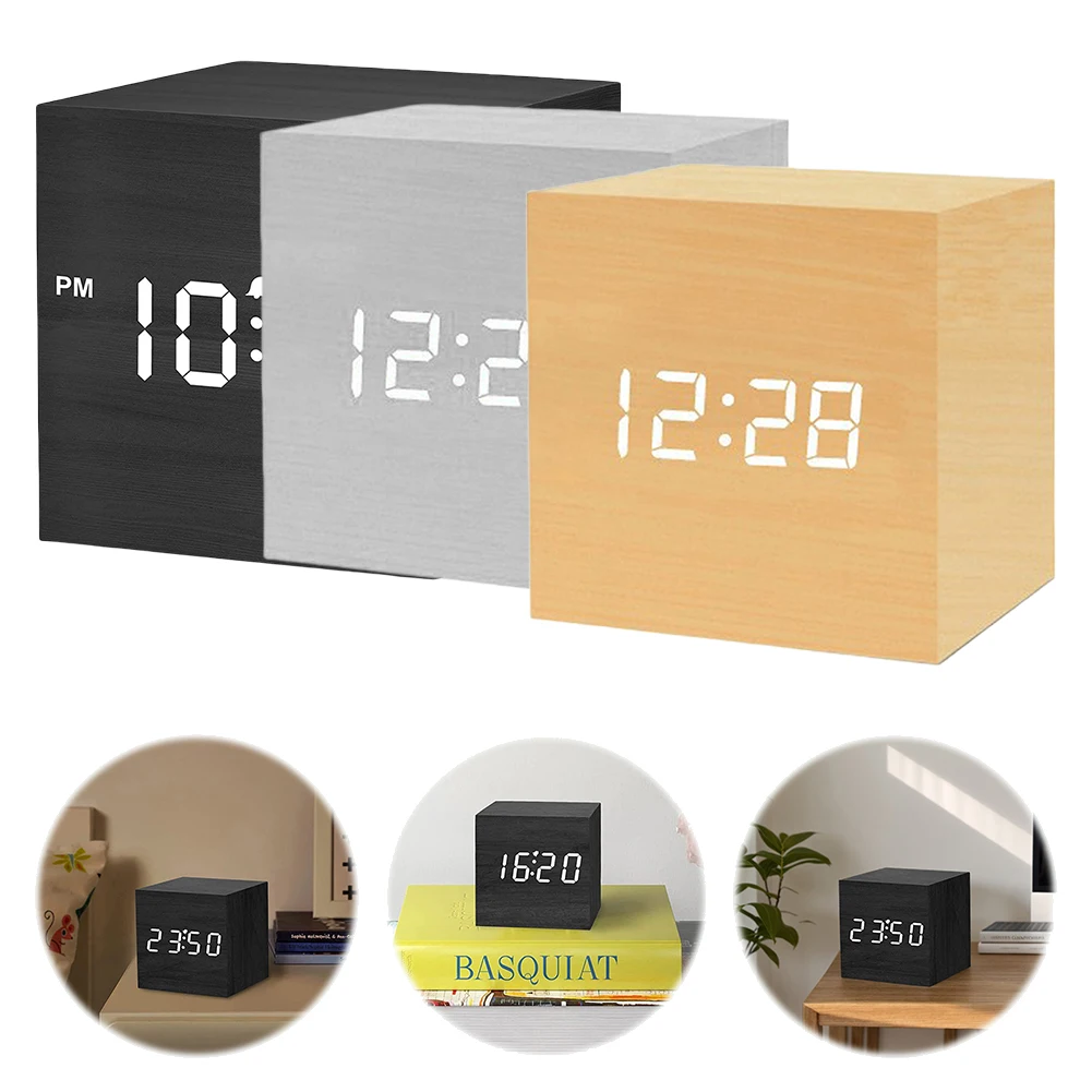 Wooden Digital Alarm Clock Voice Control Electronic Desktop Clock USB/Battery Powered LED Clock Art Ornament for Home Decoration